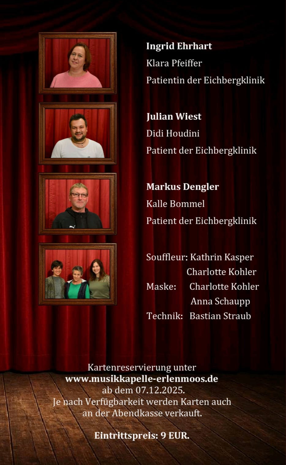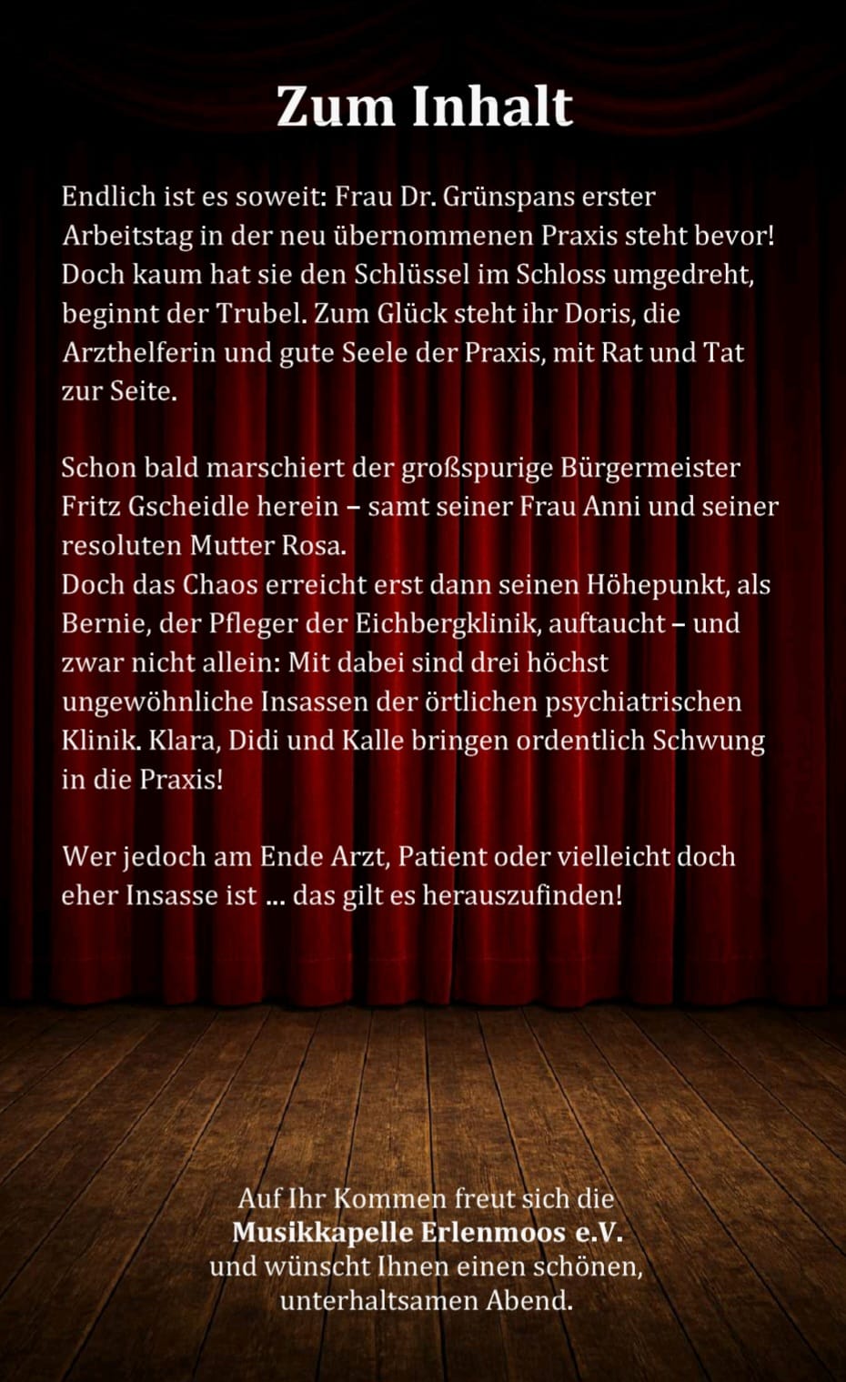 Die Musikkapelle Erlenmoos lädt Sie zum diesjährigen Theater mit dem Titel "Schmerz lass nach" ein. Seien Sie gespannt und genießen Sie einen unterhaltsamen Abend.